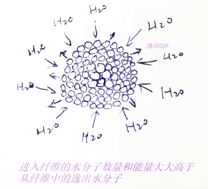 最后要说的是,对于高F数的纱线,在纱线内部纤维密集区,水分子由于处在网状的如迷宫般的狭小通道中,相互碰撞摩擦几率大大增强,而且和纤维自身的